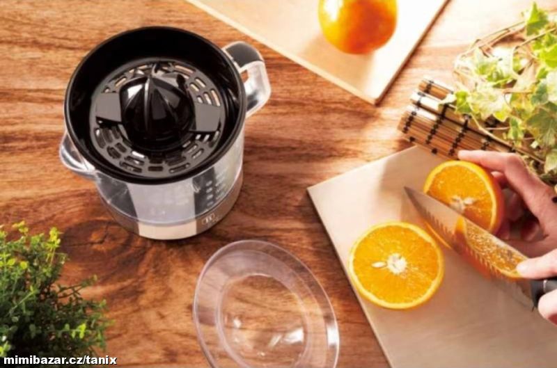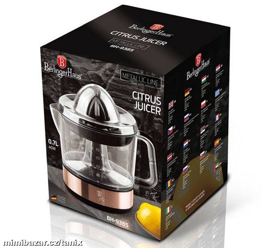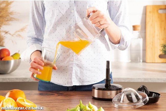 Designový elektrický odšťavňovač na citrusy z kolekce Rosegold Vhodný pro různé druhy citrusových plodů, citrony, limety, pomeranče i menší grepy. Lis lze rozebrat na několik částí což velmi zjednoduší čištění stroje. Většinu částí lze pohodlně umýt v myčce. Díky rukojeti a výlevce lze vymačkanou šťávu ihned servírovat rovnou z nádoby. Bezpečnostní pojistka. Odšťavňovač je nový, nepoužitý a nevybalený.