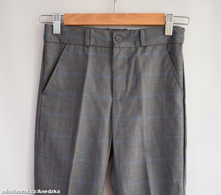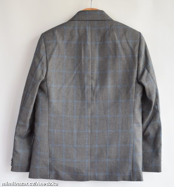 Tm. šedý oblek s modrým kárem.