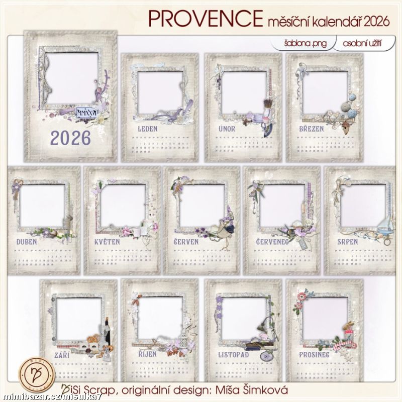 Jemný, decentní kalendář s vůní levandule a doplňky ve stylu Provence a francouzského venkova. Kalendář je vhodný pro fotky všech věkových kategorií - miminek, odrostlých dětí i dospělých.