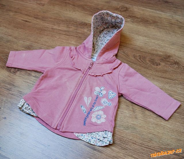 ...100% bavlna, vel. 68 (6 - 9 měsíců). Na prsou malý narezlý flíček, jinak v bezvadném stavu. Zip je zcela v pořádku, mikina určitě ještě dobře poslouží, flíček zohledňuji v ceně.