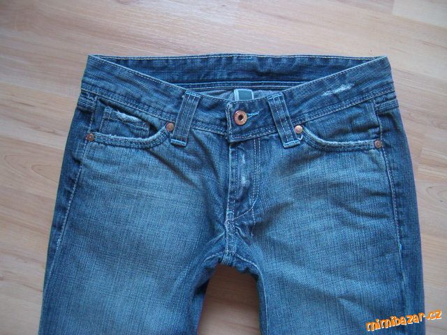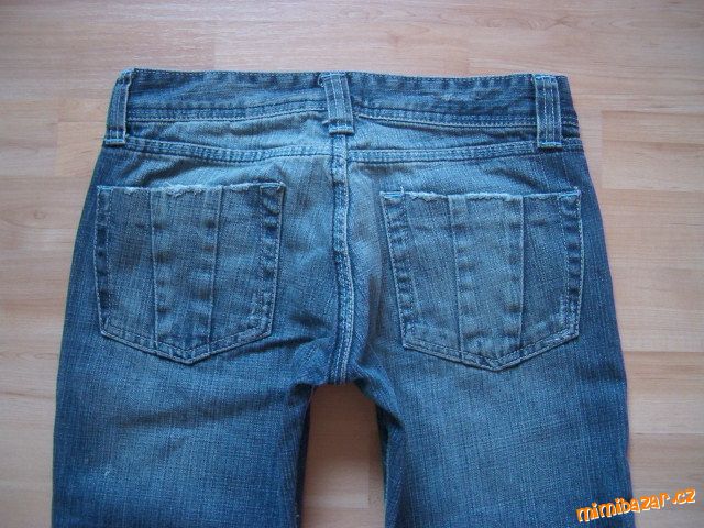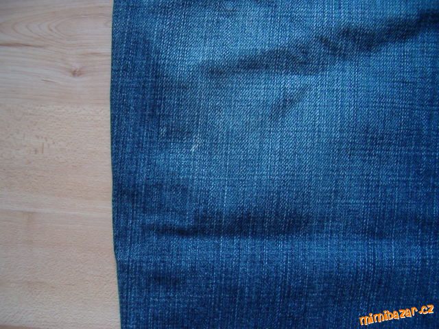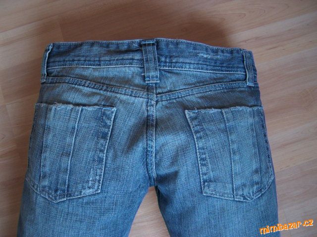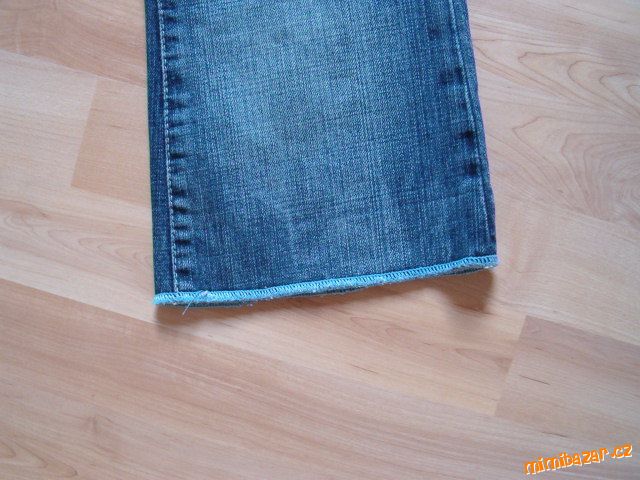 Moderní džínové tříčtvrťáky tříčtvrteční kalhoty, dřená místa, mírně šisnuté, prošívané světlemodrou nití, dole obšité taky světlemodrou (takto už koupené, je to origoš). Dají se ohrnout a taky to vypadá hezky. Nošené, ale pořád pěkné, najde se nějaký kazík v látce, ale nic hroznýho a při nošení to ani není znát - vše zohledněno v ceně.