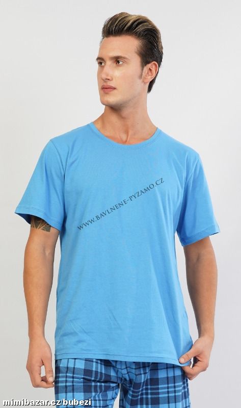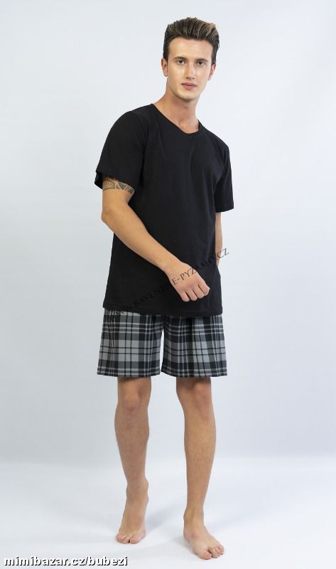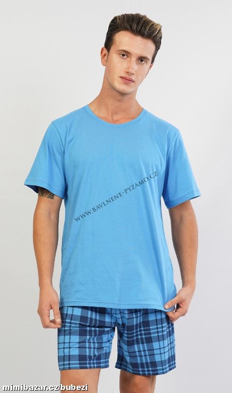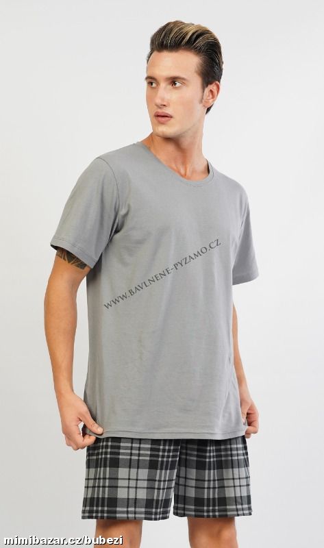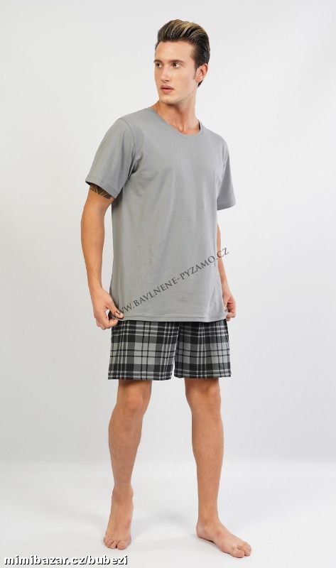 Pánské pyžamo šortky Aleš. Pánské pyžamo se skládá z trička s krátkým rukávem a krátkých šortkových kalhot.Jednobarevné tričko s kulatým výstřihem vhodně doplňují kostkované kalhoty v příjemných tlumených barvách. Použitý materiál je jemný a poddajný na dotek. Pyžamo je vhodné na denní nošení.