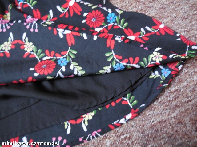 Moc pěkné, jemné, málo nošené. Na omak velice příjemné. V pase pružné. S jemnou podšívkou. Velikost 38, délka: 80, š. dole: 82 - 88, boky: 53 - 64, pas: 28 - 50, průramky, prsa: 46 - 51 cm. Mat. polyester