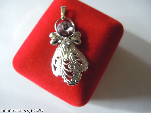 Přívěsek Anděl v šatičkách má krajkované šatičky, srdíčková křidélka, na krku maličký bílý kamínek Swarovski Elements