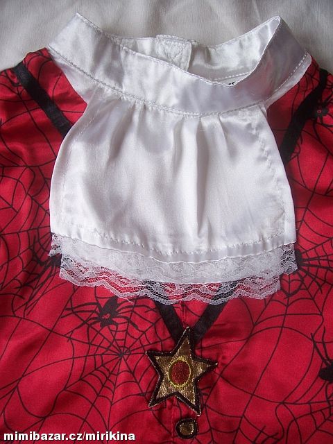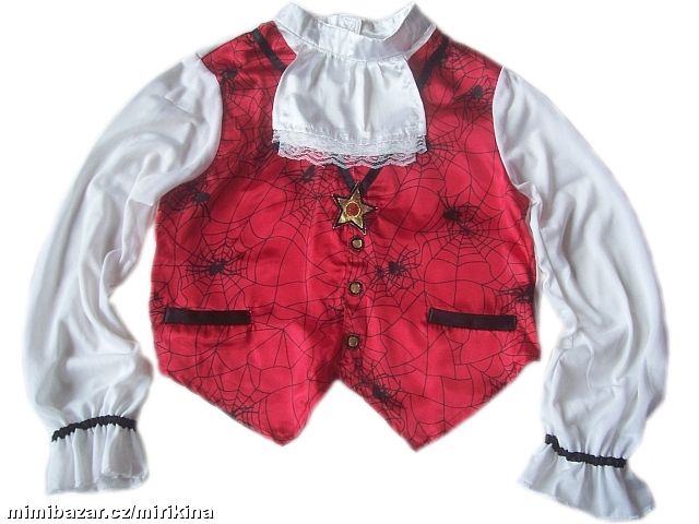Karnevalová halena pro upíra Drakulu, vel.uved.9-10let.D.zad od ramene 35cm, d.uprostřed zad od švu stoj.35cm, š.pod r.41cm-vzadu je to elastické, d.r.od švu stoj 62cm.Vzadu slabší, elastická látka.Nošená, má trochu zatržené nitky,jinak pěkné