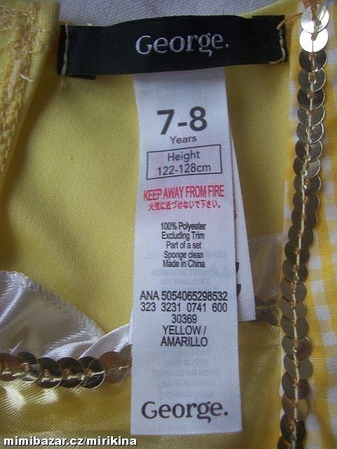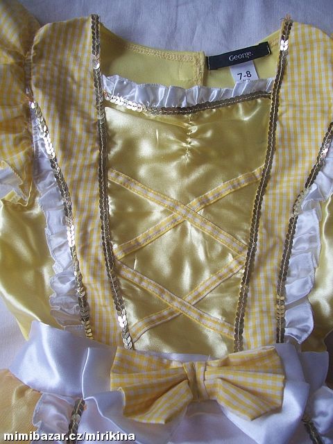 Karnevalové šaty pro Goldie z pohádky Zlatovláska a tři medvědi, vel.uved.7-8let.D.zad od ramene ke konci sukně 69cm, d.zad od ramene k pasu 31cm, d.uprostřed zad 67cm, š.pod r.31cm-vzadu je to elastické, pas v klidu 24cm, natáhne se tak na 33cm.Vespod…