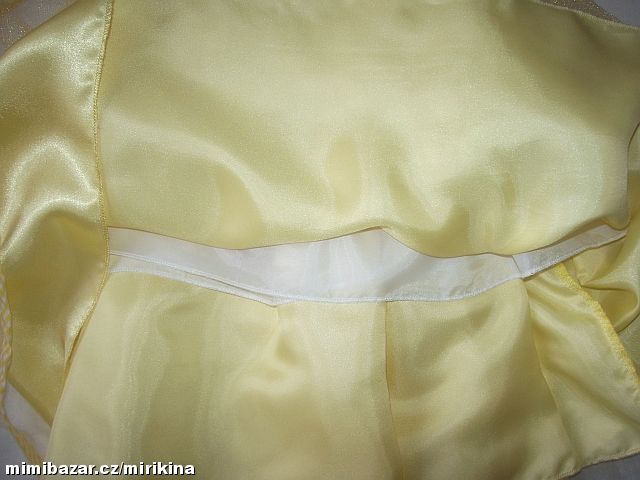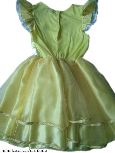 Karnevalové šaty pro Goldie z pohádky Zlatovláska a tři medvědi, vel.uved.7-8let.D.zad od ramene ke konci sukně 69cm, d.zad od ramene k pasu 31cm, d.uprostřed zad 67cm, š.pod r.31cm-vzadu je to elastické, pas v klidu 24cm, natáhne se tak na 33cm.Vespod sukně je silon, pak je satén a svrchu jsou dvě vrstvy síťoviny.Nošené, mají lehce zatržené nitky, ale stále pěkné.