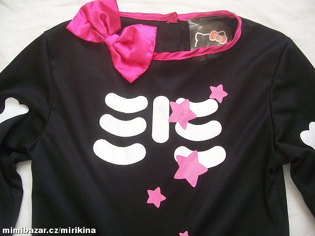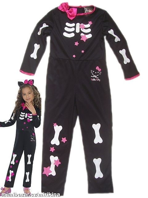 Karnevalový kostým kostlivec-Hello Kitty , vel.uved.S.Odhaduji tak 4-6let.Ale prosím měřte mohu se mýlit.D.zad od ramene ke konci noh.95cm, d.uprostřed zad k rozkroku 51cm, š.pod r.31cm-je to elastické, d.r.od krku 46cm.Je bez čelenky.Nošený, stále pěkný…
