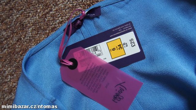 Moc pěkný, nový, ještě s cedulkami. Vhodný i jako dárek Kolekce, kterou navrhovala známá ikona modellingu Twiggy. Velikost 34, délka: 71, š. dole: 47 - 48, pas: 42 - 43, průramk, prsa: 43 - 44, rukáv od krku / dole: 29 / 8 cm. Mat. viskoza