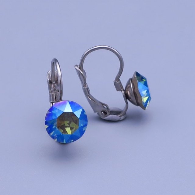 Krystal Swarovski s výrazným brusem v barvě erinite shimmer ( měnící světlá modrá ) o velikosti 8mm je uchycen na pohodlném zapínání z chirurgické oceli na klapku.