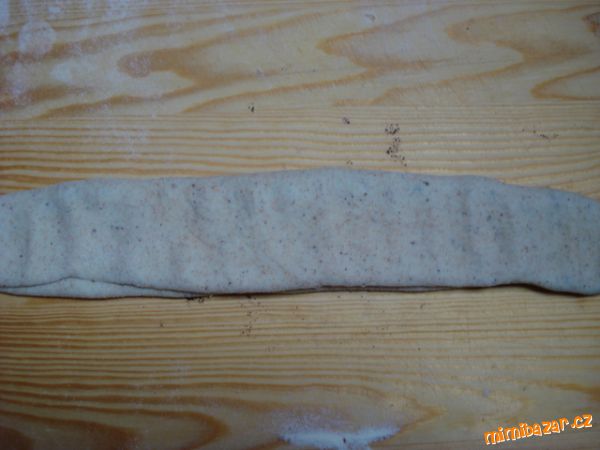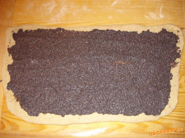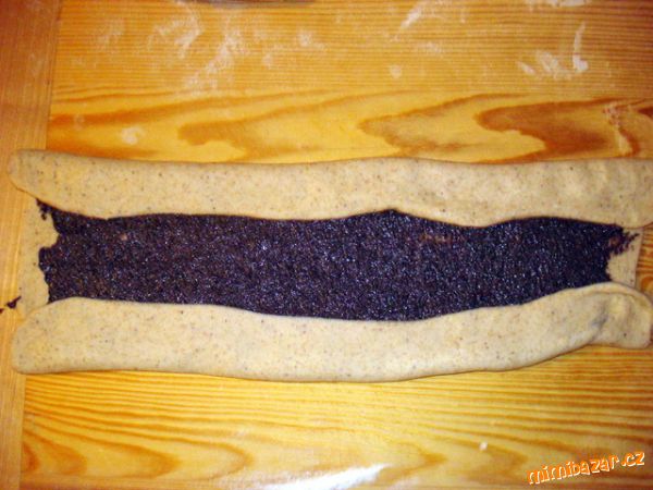 - Každý kousek těsta vyválíme na obdélník, potřeme ho vrstvou makové náplně a srolujeme do roládky, kterou ještě prsty trochu smáčkneme.