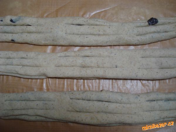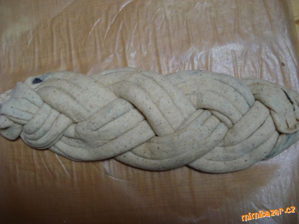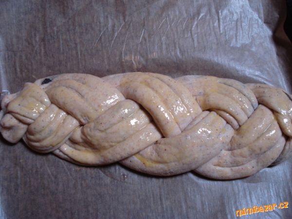 Z roládek spleteme dva copy ,necháme je chvilku nakynout,pak jeden cop přendáme na plech vyložený pečícím papírem,potřeme ho rozšlehaným vejcem,na něj položíme druhý cop,opět ho potřeme vejcem.Vložíme do vyhřáté trouby,pečeme při 180°C 45-50minut,ke konci teplotu snížíme na 160°C.