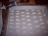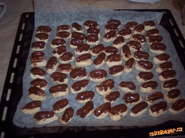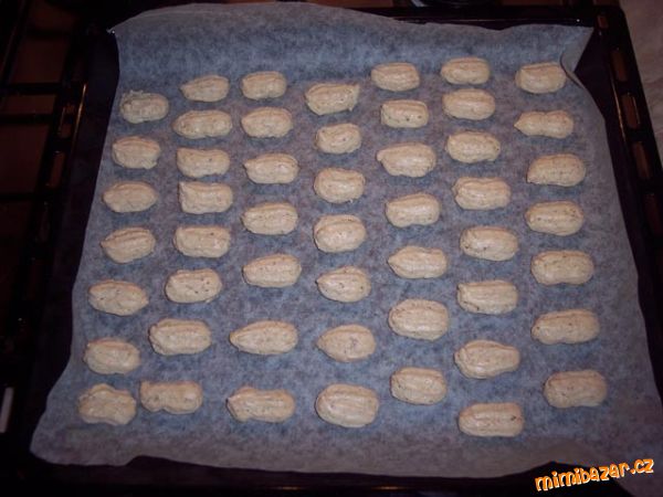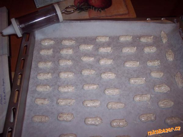 - Nad parou ušleháme bílky s cukrem krystal do zhoustnutí. Odstavíme a přimícháme mleté ořechy a mouku. Na plechu vyloženém papírem na pečení tvarujeme zdobičkou proužky (trochu "nakynou", nejlépe dělejte malé tenké proužky a dávejte dále od sebe) a pečeme tak na 150 stupňů do hněda.