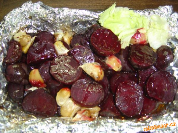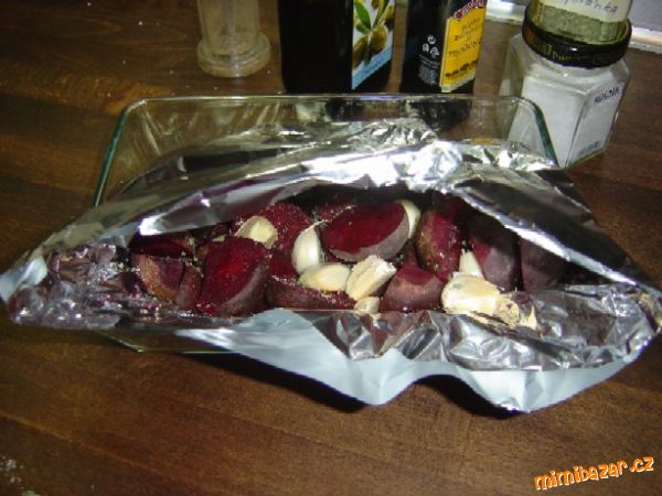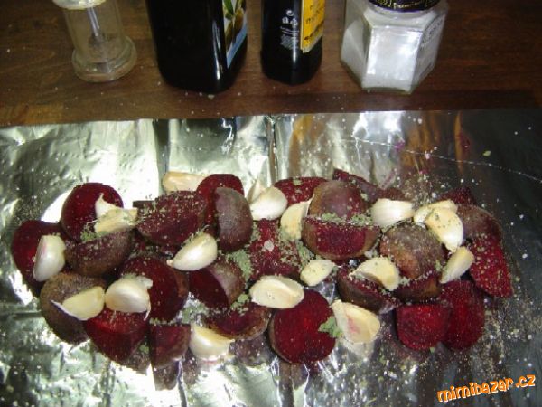 - Připravíme si delší pás alobalu (dvojité). Na něj dáme řepu (pokrájenou na poloviny, větší na čtvrtiny), neoloupané stroužky česneku, sůl, čerstvě mletý pepř a majoránku.