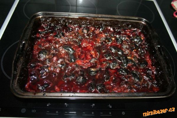 - Švestky umyjeme, vypeckujeme a dáme do pekáče. Pokapeme octem a dáme péct na 250 stupňů. BĚHEM PEČENÍ ANI JEDNOU NEMÍCHÁME. Pečeme 20-25 minut.