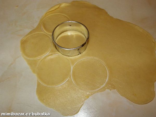 - Na vále, nebo na pracovní desce vyválíme pod potravinářskou fólií těsto, velmi tence. Já ani nepodsypávám moukou. Kulatým vykrajovátkem o průměru 5,5 cm, vykrajuji těsto, na každé kolečko na kraj položím trubičku a těsto na trubičku namotám, aby se konce spojily. Vkládám na plech s pečícím papírem.
