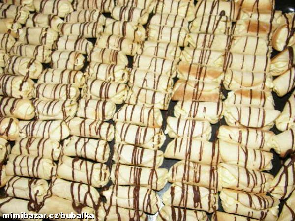 těsto: 130g másla, 3 žloutky, 500 g hladké mouky, 100 g cukru moučky, 5x lžíce mléka, 5x lžíce medu.-trubičky dlouhé 7,5 cm- Může se přidat i malá hrst kokosu. krém : 2 vanilkové pudinky, 500 ml mléka, 1 a půl másla,káv. lžička rumu, nebo kapka tresti. cukr dle chuti. zdobící sáček + špička, na dozdobení čokoládu.
